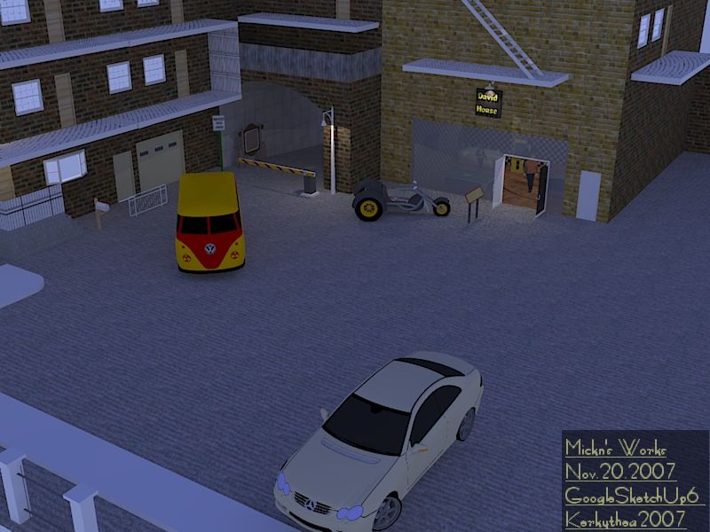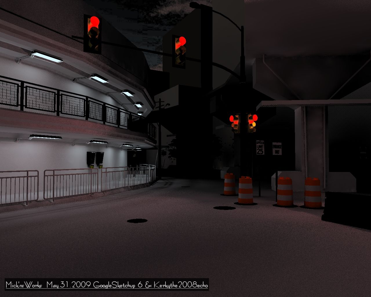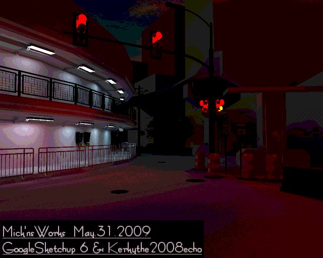 前の日記に掲載したGoogleSketchup6で描いたデータをkerkytheaに渡しレンダリングしてみました。ライトと信号を光らせたのと、空を追加したのみです♪レタッチは「JTrim」で行いました!(フリーのレタッチソフト)短時間の割りによく出来ました♪ ←push push♪