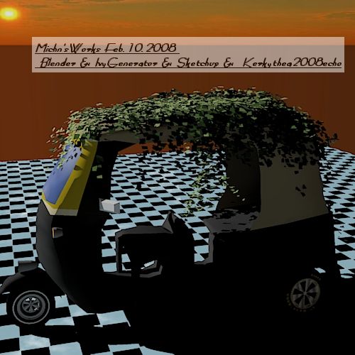 今回の作品は「トゥクトゥク」です♪タイのタクシーで有名ですが、今回のベースはインドのコロンボやスリランカなどで多く走っているタイプのトゥクトゥクだそうです♪BlenderでモデリングしてIvyGeneratorという草作成ソフトでツタを描きました♪開始点w1点指定すると勝手にメッシュに沿ってモジャモジャとツタが伸びいい感じでとめて葉っぱを生成という流れです!もっさり草はやそうとするとデータが重くてノートでやってる自分にはきつくて何度もやり直しました・・・なかなか簡単でらしいアイビーが生えたって感じでいいっすね♪ ←清き一票を♪