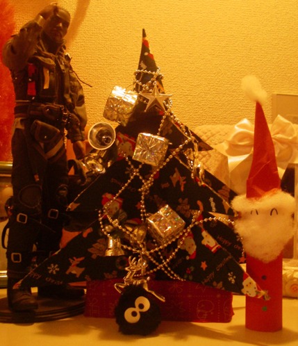 お歳暮でいただいたビールの空き箱を切って・・・・・端切れを少々調達し貼って・・・・100円ショップでそれっぽい飾りを・・・・・不況のあおりをうける家族のクリスマスツリー・・・・♪Merry christmas!