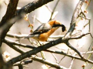 ぼんやりと外を眺めていると、目の前の梅の木にモズが止まりました。動いている虫をくわえています。あっという間に枝に2回打ち付けたと思ったら、パクッと食べちゃいました。