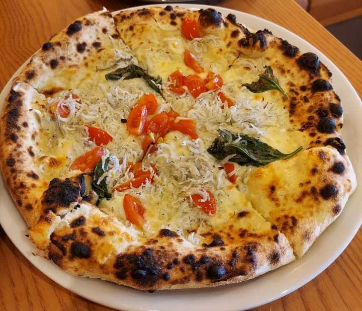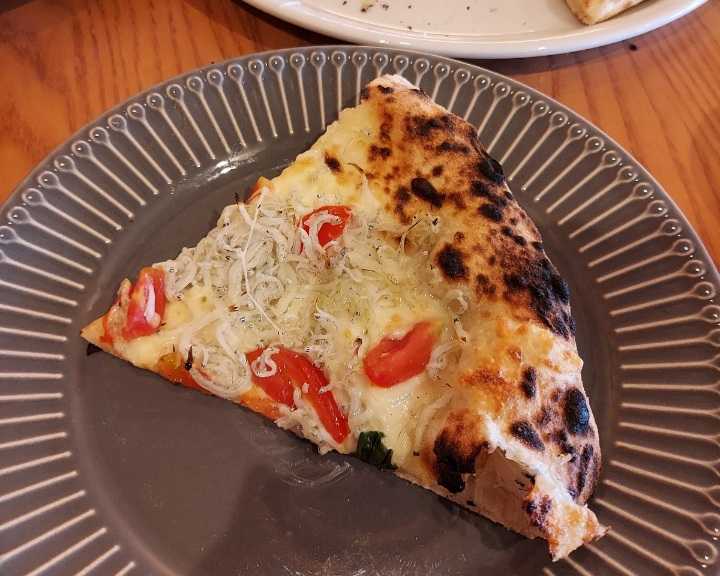 ピッツァの生地は、もちもちでほんのり甘い、しらすのチーズの相性が抜群。