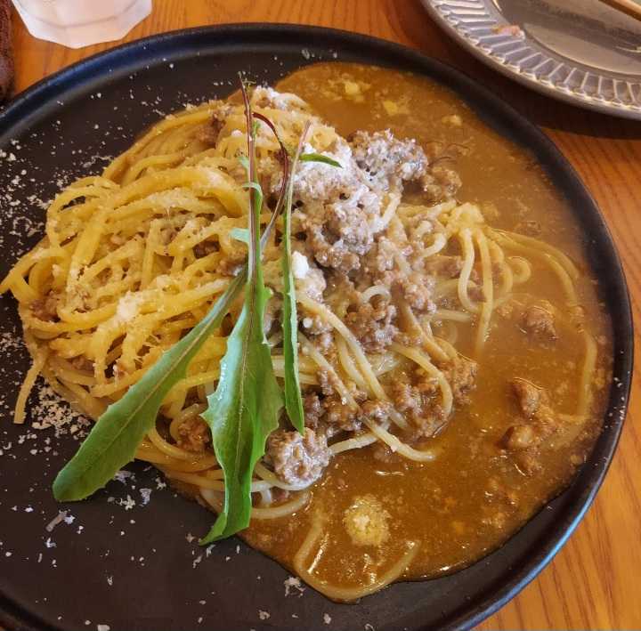 パスタはモッチモチのアルデンテ、ボロネーゼはキノコの風味がすごーくきいていました♪