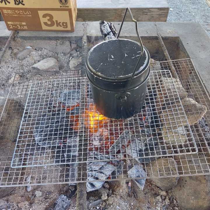 友達が持ってきた年季の入った飯盒を網の上に乗せる