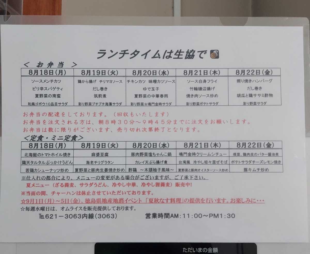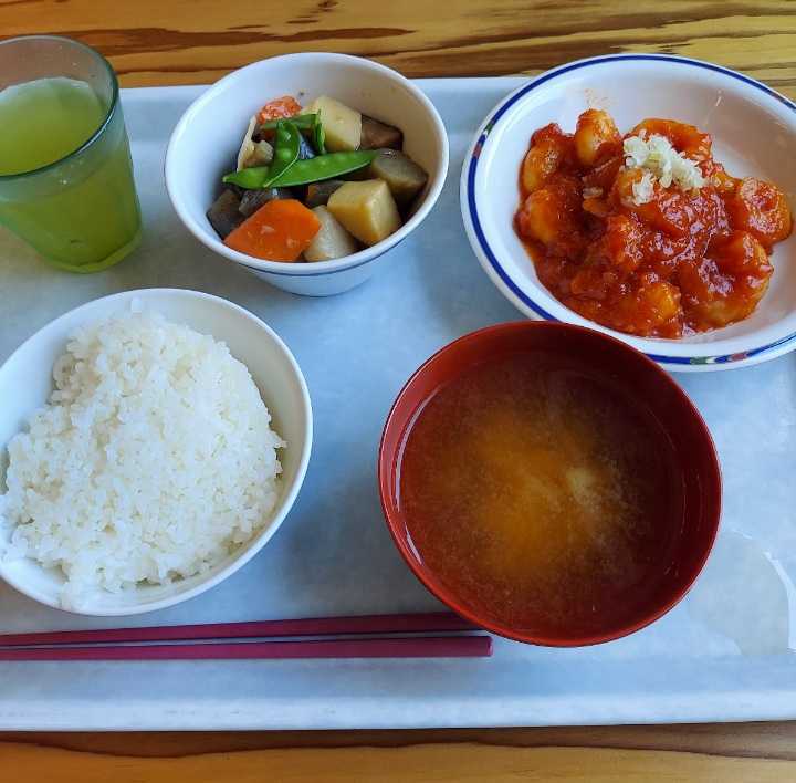 本日の主菜は表記されている麻婆豆腐、海老チリグラタン、夏野菜と豚肉生姜焼炒めの他に海老チリ、魚フライ?カツ?の卵とじみたいなの、鮭の焼き物がありました。