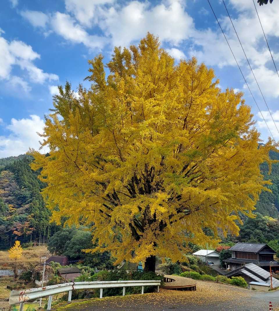 曇りのち晴れ午前10時30分今日は暇人の友人と神山のイチョウを見に行った。神山三大イチョウで有名らしいのだが、長いこと徳島に住んでいるのに見るのは初めて!おお♪3本ともわりと近い距離にある。大久保の乳イチョウ➡️黒松の大イチョウ➡️中津の満月イチョウの順に見に行くことにしよう。道の駅『温泉の里 神山』でちょいとお買い物。おっ!青唐辛子が売ってたので、友人に頂いたゆずで柚子胡椒を作ろう♪青唐辛子、ちゃんと辛いといいのだが・・・。当たり外れあるのよねぇ。道の駅の店員さんに大久保の乳イチョウの場所を聞いて、レッツラゴー♪(古っw)駐車場に停めて歩いて行きましょう!昨日(11月25日)までいちょうまつりをしてたそうです。いちょうまつりの旗がパタパタ上の方に神社が見えますプチイチョウ並木笑美しい棚田奥に一本見えるのが乳イチョウおっきい~(^ω^)めっちゃでかい!!神山町指定の天然記念物、大久保の乳イチョウ樹齢500年以上の立派なイチョウ幹はビックリするほど太いおお!形がおっぱいに似てる~(°Д°)長いけどねっ。乳が出ない女性が、願掛けしたって看板に書かれてます。
