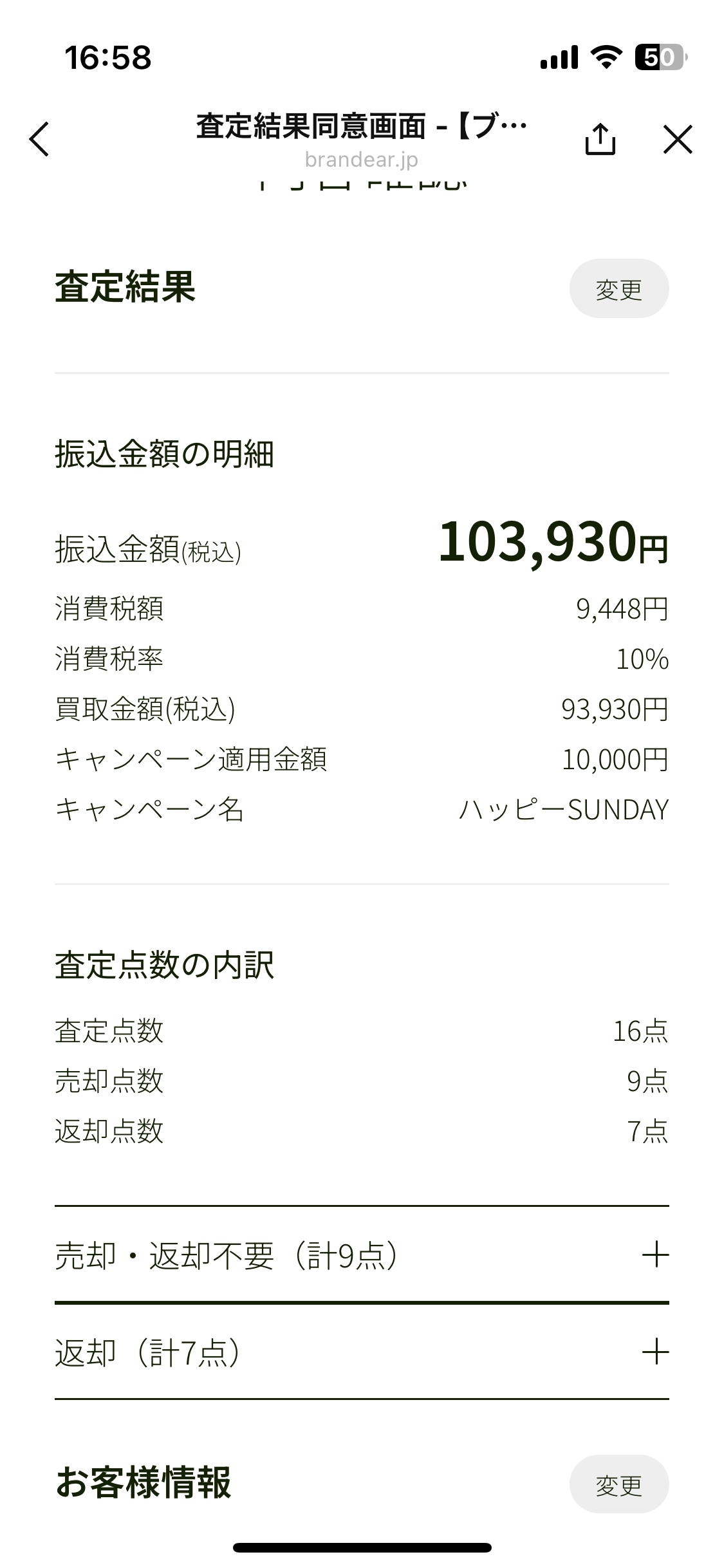 こんにちは〜雨雨雨雨でもう大変でございますわね〜涙洗濯が〜!全く乾かないしエアコンドライ運転にして扇風機回してるのに、何故生乾きになるのだ?!もう本当に疲れます…眠たい目を擦り擦り、私はせっせと生乾きの洗濯物を作っていた訳ですね…こんな事ならあの時頑張って洗濯なんてしないで、さっさと寝たら良かった!という憤り…梅雨でお疲れの全日本人の方、毎日本当に頑張ってますね。あと1ヶ月がんばりましょうwつら…先日査定に出して、結果を首を長くして待っていたブランディアさん。今回は査定に随分時間が掛かったので、結構査定に出してる人が多いんだな、という印象です。皆様夏休みに備えてるのか、もしくはゴールデンウィークのつけなのか、はたまた物価高騰のあおりをうけて家計の足しにする為か…感じるものがありますね。今日結果が出たので、私の予想と合わせてご覧いただこうと思います。①プラダボディバッグ¥9000→¥12000これはまぁ良かったかもです。プラダはリセールバリューが低いそうなので、そこそこお値段ついたほうかなと。②k10イヤーカフ¥3000→買取不可これはね〜、多分メルカリで購入した物なのですが、k10と謳ってましたがだまされた?もしくはブランディアさんがもうホワイトゴールドを買い取りしないのか。分かりませんが買取不可だったので、返却してもらいます。③k18 長いピアス特注品¥3000→¥7064これはまあまあだと思います。今k18は高値で買取されてるようですので、だいぶん特殊な形状のピアスでも買い取って頂けて良かった。まぁ買い取り店ならどこでも素材として買取してくれるので、どんな形であれk18は貴重ですね。④k18 ピアス2セット¥5000→¥12110これもまぁ良かったです。ただ不思議なのは、同時期におなじ店でおなじピアスを2セット(4つ開けてる穴に同時に着用したかったので)買ったのに、グラムが違ったこと。はて??不思議です。⑤アメジストネックレス¥4000→買取不可こちらは以前ブランディアさんに査定出して買取不可って返ってきた事を忘れてました笑まあ普通に使えるので、返ってきたら使っていこうと思います。⑥プラチナ?ピアス¥2000→k14で¥7500プラチナだとおもっていたピアスがまさかのk14でした笑まぁホワイトゴールドでもk10以上の物は買い取ってくれるという事?まぁ買い取って頂けたし、思ってるより随分高値だったので嬉しいです〜⑦k10?安全ピンピアス2こ¥4000→k18で¥17875これも多分素材として買い取りして貰ったんでしょうね。まあまあなグラムあったのか、もちろん買った時の半額ぐらいにはなってますが、長く楽しんでこのお値段で買取して貰えたらありがたいです。自分が金アレなのでk10は駄目だと思い込んでいた時期に買った物らしく、18金でした。良かった♡⑧k14wg ピアス2セット ¥5000→買取不可⑨ジュエリーツツミ k10wgピアス¥3000→買取不可この2つ、何故買取不可だったのか…k14wgのほうはじゃあやっぱりk10ぐらいだったのかな?これもメルカリで購入したのですが、やはりメルカリは危ないということですね涙⑩シエナロゼ イヤーカフk10 ¥4000→¥1500返却これ1番びっくりして。え〜ってなりました。そうなんや、、、って。いくらなんでも¥1500は酷いので、返却してもらいます。⑪プラチナダイヤモンドネックレス¥8000→¥5400返却これ…実は主人が初めてで最後のプレゼントでくれた、付き合って初めてのクリスマスプレゼントでした。今までずっと査定とかに出した事なかったけど、パーソナルカラーとか色々気になり始めるとなんかつけなくなったので、今回出してみましたが、この買取価格なら手元に置いておきます…やっぱりプラチナはダメか〜⑫k10ダイヤモンドネックレス ¥5000→¥11101これ、購入した経緯とか全く覚えてないのですが、全然付けないのでこの値段で有難く売却。⑬k18ダイヤモンド馬蹄ネックレ¥8000→¥27000これもびっくりしました!楽天で購入したノーブランドの馬蹄ネックレス。保証書とかも全部あったし、それで高値つけてくれたのかも。保証書大事!それと今回で身に染みて分かったのが、18金はやっぱり強いな!ホワイトゴールドは駄目だな!プラチナも駄目だな!と。好きな物を持つのが勿論一番いいに決まってますが、私がイエローベースだからと言うのもありますが、今後持つなら絶対18金にしようと心に決めました。リセールバリュー、大事。合計¥93930こちらにハッピーサンデーキャンペーンで12パーセントup(ハッピーサンデーキャンペーンは上限1万円なのでご注意ください)合計¥103930とりあえず、思ってたより高値で買い取って貰えて良かったです^^返却が7点もあったのに16点の予想合計額より高かった!後は楽天ポイントと私のメルカリの売上金を足して¥166930か…残り¥317070か…道のり遠い汗どうやって稼げはいいのか…また思いついたら書いてみます。皆様もこの機会に断捨離がてらに査定出してみるのもいいかもしれませんね^^