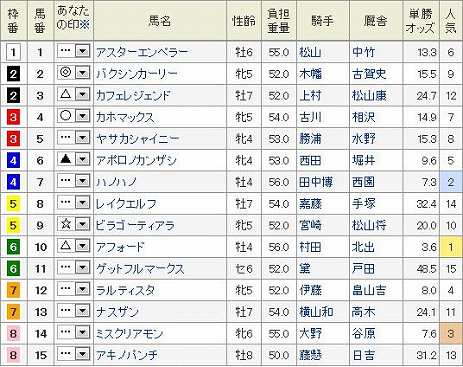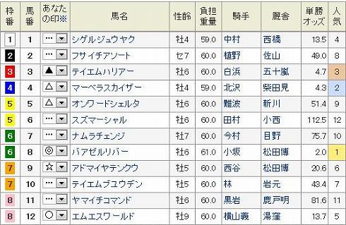 門別12R エトワール賞ダート1200m 発走20:35 (見解) 層が薄い道営スプリント界3歳馬も混じり難解な一戦 大外だが捌きがスムーズになりいい方に出そうな◎ 12 タイセイアドミラル外から豪快に差し切り期待。 当地同条件でクラーベセクレタと僅差し力ある〇 5 クイックスター JRA準OPで地力ある▲ 11 ギンゲイもここでは大崩れはないだろう。 あとは かなり不利だが末脚活きれば△ 2 ロクイチスマイル 人気しているが勢いある △ 4 アベニンプラナス 今度は適距離で警戒必要な☆ 6 リバーキンタロー 本線 3連複 1頭軸 12(2.4.5.6.11) 押さえ 3連複 1頭軸 5(2.4.6.11) ぽちっとよろしくねにほんブログ村