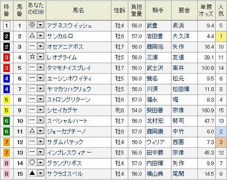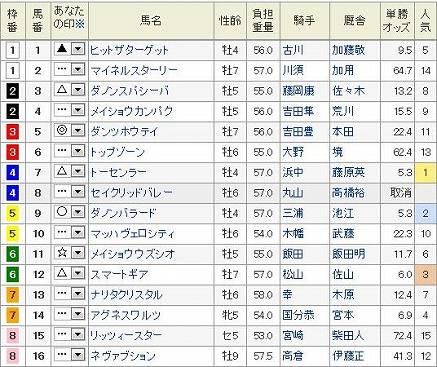新潟11R 新潟大賞典 GIII 芝2000m 発走15:20 4歳上オープン (国際)[指定]ハンデ 15頭 (見解) 乾いた良馬場を想定して予想していたのだが、TVで競馬場を観るとそこそこ雨が降ってるやん。道悪が苦手な馬には影響がでそう。いつも穴で狙いの◎ 5 ダンツホウテイ雨はまるっきしダメ ・・・陣営談 思い切って予想変更だやや重~重を想定した予想 買い目 本線というかお遊び程度 3連複 BOX (1.3.4.9.11) ダンツホウテイ気配あったのにね。 ぽちっとよろしくねにほんブログ村にほんブログ村
