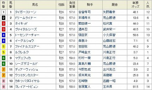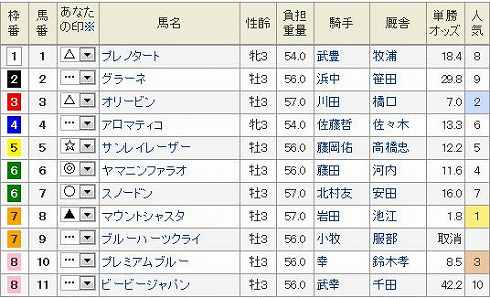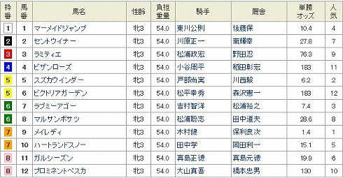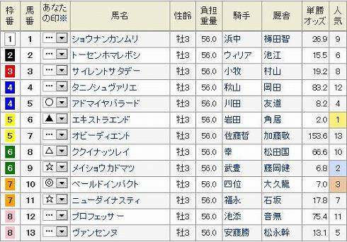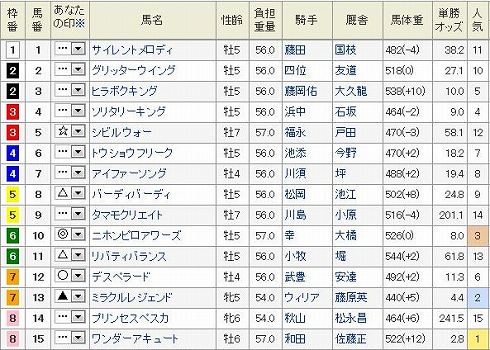 東京11R ヴィクトリアマイル GI 芝1600m 発走15:404歳上オープン (国際) 牝馬 (指定) 定量 18頭 (見解) 狙いは◎ 10 フミノイマージン確実な末脚でいよいよGI奪取が見えてきた。 世代レベルがよく分からないが、〇 14 ホエールキャプチャ総体的にあまり買いたくないのだが、分からないのだからもう一度買ってみる。 さてこれはどうだろう▲ 7 アパパネきっちりGIでは変わる不思議な馬だ。昨年もこのレースでブエナビスタに勝っているのだから格では断然だが。でもこれもあまり買いたくないよな。 あとは買いたい順に△ 3 キョウワジャンヌ△ 5 アニメイトバイオ△ 1 マルセリーナ△ 11 アプリコットフィズ△ 16 ドナウブルーを押さえます。 買い目 3連複 1頭軸 10(1.3.5.7.11.12.16) 押さえ 3連複 BOX (3.5.7.12) ワイド 102.4.6.8.9.13.14.15 8枠を除く残り目 ぽちっとよろしくねにほんブログ村にほんブログ村