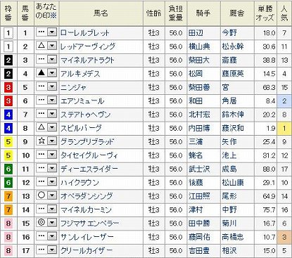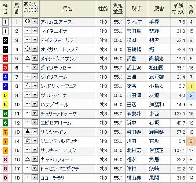 東京11R オークス GI 芝2400m 発走15:403歳オープン (国際) 牝馬 (指定) 18頭 (見解)桜花賞で◎ジョワドヴィーヴル6着と〇サウンドオブハート4着をここでもう一度狙いたかったが、両馬とも不在で一から練り直すことになった。焦点は桜花賞組vs別路線組どうも順番が決まらない。それだけ混線か色んな組み合わせでうまく絡んでくれたらいいが。 狙いは◎ 1 アイムユアーズBコースで内枠有利なのとウィリアムズということで他より条件がいい。GI2戦でも2.3着と下地はある。 ブリンカー着用してきた〇 4 オメガハートランド内枠のブリンカーは集中力持続に効果ありそう。 ▲ 13 サンシャイン明日のイベントに向けて晴れれば。これはしょうもない冗談だが、大掛けタイプで一発期待する。 あとは買いたい順に 忘れた頃にやって来る忘れな草賞勝ち馬△ 16 キャトルフィーユ 桜花賞馬は距離不安でも能力で通用してしまうので☆ 14 ジェンティルドンナ これくらいだがさらに △ 5 メイショウスザンナ△ 8 ミッドサマーフェアを押さえます。 買い目 3連複 1頭軸 1(4.5.8.13.14.16) 押さえ 3連複 BOX (4.5.8.13.14.16) ちょっと買い目が35点になり多いがヒモ穴でも来てくれれば 昨年のオークス予想は・・・ ぽちっとよろしくねにほんブログ村にほんブログ村