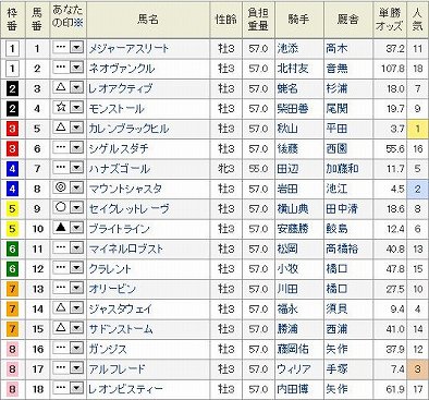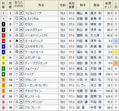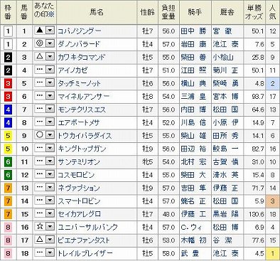 東京11R NHKマイルC GI 芝1600m 発走15:40 3歳オープン (国際) (指定) 牡57K 牝55K 18頭 (見解) 度肝を抜かれた天皇賞まさかがあるから面白いのだが、現役NO.1まであんな負け方を平気でする近代競馬になってしまった。 ますます疑いたくなるが、このレースは皐月賞に向かわず、ここに標準を合わせていたと思っていたヒストリカルを大本命に決めていた。しかしダービー直行らしいね。勝負するつもりでしたので、肩透かしを食らった。 大穴狙いに徹しようかと考えたが、荒れそうと思ったときに限ってほどほどで終わる。これもそんな感じか。 予想は タフなコースの阪神1800m毎日杯は評価できるので、ここで2着した◎ 8 マウントシャスタ岩田に替わるのもプラスにでそうだし、あれだけ賑わせているのに今回は唯一のディープ産駒。不思議だが上級馬はダービーがあるからかと納得。 府中が向きそうで叩き2走目の〇 9 セイクレットレーヴこれなんかは巧く捌けば爆発力ありそうだが。 展開待ちにはなるが、末脚が魅力な▲ 10 ブライトラインそこそこ差し込んできそう。 これ1番人気△ 5 カレンブラックヒル前哨戦NZTがちょっと鮮やかすぎて気持ち悪い勝ち方だが・・・地力戦になった時心配ですが、分からないので押さえは必要か あとは買う気のある順に 皐月賞から回ってきた☆ 4 モンストール 外だが兄は香港ラッキーナインで適性ありそうな△ 15 サドンストームの一発 休養明けで馬体が減っていそうな状態らしいが、天皇賞も唯一前検量で減っていたビートブラックの例もあり、今まで戦ってきた面子が違う△ 14 ジャスタウェイと あくまで調教だが1週前抜群だったらしい(いつも攻め掛けする馬はいるのであまり参考にはしないが)△ 3 レオアクティブまで押さえるます。 買い目 本線 3連複 1頭軸8(3.4.5.9.10.14.15) この内5-8-14は安いのでパス 押さえ 3連複 BOX (4.5.9.10.15) ぽちっとよろしくねにほんブログ村にほんブログ村