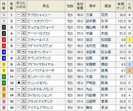 東京11R プリンシパルS 芝2000m 発走15:45 3歳オープン (指定) 馬齢 17頭 (見解) こちらもダービーへ残り1枚の切符を掛けた戦い。しかしこれもダービーに直結できる面子ではなさそう。 ◎ 15 フジマサエンペラー穴党ご用達の馬だ。いつも以上に条件は揃ったため大穴にはならないが、力のいる馬場にシンボリクリスエス×チューニーはもってこいと思う。不安は外枠ということかな。 こういう時に出番がありそうな〇 13 オペラダンシングオペラハウスに母父ダンシングブレーヴもっと道悪になってもよかったが。江田照とのコンビでプンプン大穴気配が ▲ 4 アルキメデスインで折り合い付けばそこそこ来そうだが。 Rさんが投資したエンプレスティアラの仔の兄△ 2 レッドアーヴィング本質はダートかもしれないが、時計掛かるなら。 あとは ここの厩舎の一本被りは怖く切りたいのだが道悪もこなせるので△ 8 スピルバーグに これもRさんが所有していたオークス馬 シルクプリマドンナの仔☆ 9 グランプリブラッドを押さえる。 買い目 本線 3連複 BOX (2.4.8.9.13.15) これは配当がいいので全部 それに 単・複・馬連・ワイド 13・15 ぽちっとよろしくねにほんブログ村にほんブログ村