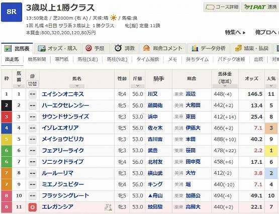 8/3(日)広尾TC出資馬エレガンシアの7戦目です。ルーラーシップ×ステラリード2020.2.3生関西 高柳大輔厩舎 5100万3000口 一口17000円札幌8R 1勝C 芝2000m鮫島克駿騎手53kgがんばれ!馬券22.1倍 7番人気小倉から栗東へ戻り函館→札幌へ長距離輸送がありましたが馬体重は+2Kgの440kgで減らなかったので随分しっかりしてきたのでしょうね。パドック&返し馬※公式クラブ画像は許可を得て掲載しています!勝った鮫島克駿騎手なのでが内枠でも引いて流れに乗れればチャンスかな?と思ってました。発走です。最悪の大外でやはり前走同様ゲート五分に出てもズブいのか後方からの追走になりしかも手応えももうひとつに見える。3~4コーナーで1番人気が馬也で捲って行った時にその直後着いていきたかったですね。直線へ。イン付きの構えだが3段壁で全く進路がない。結局は大外にまで持ち出すロスだらけの競馬でしたが最後はそれなりに脚は見せ勝ち馬から0.7秒差の6着でした。結果2:01.1 (上り3F35.2秒)6着枠もあるでしょうがもう少し前半から前進気勢ほしいね。流れに乗れないちぐはぐなレースでした。残念。お疲れ様7戦1勝 671万全芝(1-0-0-6)ぽちっとよろしくね