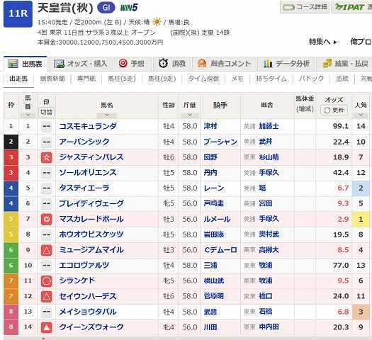東京~天皇賞・秋予想です。ダービーは惜しくも届かず2着だった◎マスカレードボールから。負けはしたが一番強い内容だったと思う。それ以来になるが順調に調整されたようで問題ないでしょう。大きなストライドで府中向きでしょう。ルメールなら初の古馬相手でも勝負に。相手は牝馬ながら大崩れ少ない〇シランケドを。強力牡馬相手がどうかも条件問わずやれるのでいいことあっても。あとは大外どうかもこの条件合いそうな▲クイーンズウォークと唯一のディープ産駒で好枠で時計持っている☆ジャスティンパレスの連下に注意したい。◎ 7 マスカレードボール〇 11 シランケド▲ 14 クイーンズウォーク☆ 3 ジャスティンパレスヒモ△は9 ミュージアムマイル12 セイウンハーデス買い目3連複 1頭軸7(3.9.11.12.14)30~293倍3連複 2頭軸(11.14)3.9.12(3.11)9.12(3.14)9.12224~1281倍ぽちっとよろしくねにほんブログ村競馬ランキング