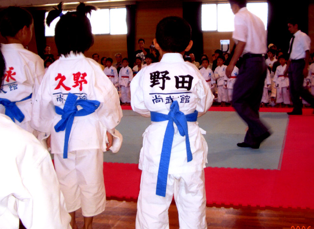 貫太朗!試合デビューしました!それももうすでに一ヶ月前に!9/23に!はははは!そうとう緊張している!こんな顔メッタに拝めません(笑)彼のなかでも相当なプレッシャーだったでしょうね!だって、試合会場入るところで涙ながらに母親に訴えたそうです!「いきたくな~い!」 そんな訴えは見事却下され道衣に着替えさせられました。ココまで来るとさすがに腹をくくったか泣く様子もなく試合をしたようです!順番は幼年部のトリ!周囲は「noaichiの息子やん!」というまなざし・・・結果は・・・負け。最高のスタートです!私も空手をはじめたのは小学校の3年生のころ・・・入門まもなく私も試合に出させてもらいました。忘れもしません!開始線にたった目の前に試合をする相手が立っていた・・・・女!しかもでかい!年齢は私より2つ上!今でも覚えてる!名前は、林田みゆきさん。「勝負・・・・・はじめ!!!!!!」のコールにのって私 蹴りを出す!しかし、入門まもない私 そんなに上手く足技が決まるわけもない!その足はいとも簡単に空を舞い・・・気がつくと私の視界は天井を向いてた・・すってんころりん試合は完敗・・・それが私の空手人生の始まりでした(笑)あ~懐かしい~