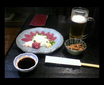 大平燕(タイピーエン)熊本では超ポピュラーな食べ物らしいですね!あまりにもポピュラーすぎて熊本の人はこの大平燕どこにでもあるものだと思ってたくらい!・・・で、気になるお味ですが・・・うまい!(すみません・・ありきたりな感想で)そしてボリュームまんてん!あのね~ご存じない方のために解説しますね!ズバリ!麺がはるさめ!スープはあっさり!具はちゃんぽんみたい(具沢山)!しかしホントこれなら気軽に作れそうだし、ヘルシーだしオナカ一杯になりました! そしてやっぱりこれは欠かせないでしょうね!うまうま! 真ん中がたまねぎスライス、手前の馬刺しがいいところからとった馬刺し、で、その肉と馬刺しがきれいに並んでいるところの間にある白いものがタテガミというもの!わたしこのタテガミ大好き!タテガミって読んで字のごとく馬のタテガミのところの肉(?脂?)なんですよね最初見たとき「うわっ!脂やん!」と敬遠してたけどさ食べてみるとこれがさ!美味いわけよ!何ていうんですかね~噛まなくっても溶けていく・・・そう!溶けるんですよ!タテガミが!口の中で!わたしタテガミ大好き!でも、これもなんか知らないけど美味いタテガミとあんまり口に合わないタテガミもある! その違いは、食感ですかね?歯ごたえ? いいやつは噛まなくても溶けてなくなっていく、一方口に合わないタテガミは噛む噛む噛む!あと、美味いのは馬のレバ刺し! こっちの人たちはどうやらレバ刺しといえば馬だと思ってるらしい!現に、居酒屋さんとか行ってもねレバ刺しを頼めば大体馬のレバ刺しが来る!この馬のレバ刺し・・・これまた食感が最高にいい!牛のレバ刺しとは一線を画した食べ物だとおもっていいかも(言い過ぎ?)あぁ~また食いたくなってきた!今日の晩飯は馬レバ刺しだなコリャ!