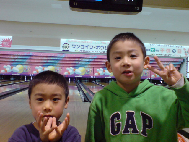 日曜日はうちのかみさん婚礼のお手伝い(元美容師です)で福岡まで行ったものですからnodaichi家野郎3人で日曜日を過ごしました昼に近い朝飯をすませ二人のリクエストに答えるべく・・・ボーリング場へ!! 今は子供用にガーターレーンを・・・なんていうんですかねあの~ようするにガーターが出ないようにできるんですね~投球後の貫太朗の雄たけびが・・・うけました(笑)真之介にはどの球も重いようで・・・こうやって転がしてました こんな二人でもストライクやスペアを取ったりするのには参りました そんなこんなで野郎3人の日曜日は過ぎていきました 夕方5時から一時間彼らと愉しく入浴 ツカレタァ~ PS 近く後部座席もシートベルト着用が義務付けられるとか聞いたので早速練習おりこうさんでした~