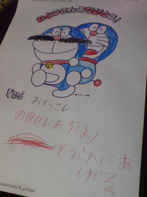 長男 貫太朗はラクガキが大好きです! 先日もドラえもんのHPから 塗り絵をダウンロードしてプリントアウトして渡しました その中の一枚・・・ さりげなくワタシの机の上にこの一枚が・・・ メッセージまで書き込んでくれて・・・ 泣けてくるな~ 人を喜ばすって こういうことかな~ これやれば喜ぶだろう・・・と思ってやるのも必要だけど おそらく彼くらいの年代の子ってのはまだ そういうこと考えてやってるわけないから 素直にうれしかったです こういうさりげない優しささりげない思いやり できる大人になりたい そういう「人を喜ばす」もありなんですね~!