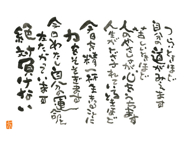 どうしたnodaichi?? ひまなのか?? いや・・暇ではないのだが・・ むしょうに 書き込みしたい! ごらんのみなさん!勘弁してね~ こんなもの書いたんです 実はこの文は 私の先輩から紹介いただいたんですちょうど先輩も事情があっていろいろ悩まれててそんなとき先輩の先輩が経営されてる飲食店に行かれたときふと目にされた詩だったんです。 この詩を紹介されたときも凄く感動して・・・あらたに今読み返すとさらに感動してしまった・・・ で、感性のおもむくまま筆をとり書いてみました いま、やっと今年第一番目の葉港メール(紙面版)書いてるんですがそこで「プレゼント」用紙を準備させていただいております。 サイズははがきサイズです このブログでもいいですよ!(笑) お待ちしております~ もちろん 無料! 何枚でもOK!