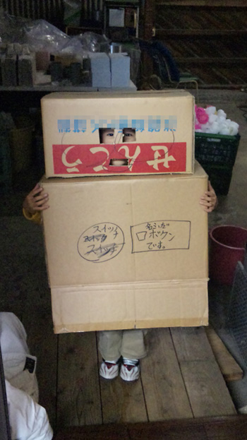 こないだ奥の作業場で仕事をしていると「お父さん~!」という息子たちの声何だ??と入り口を除いてみるとダンボールでできたハリボテロボット!「ロボクン」(書いてある) 中に入っているのは次男製作者は長男 感心してしまった(笑) さぁ~今日は東京です!お金がかかっている分しっかりとモトとってきますよ~(笑)