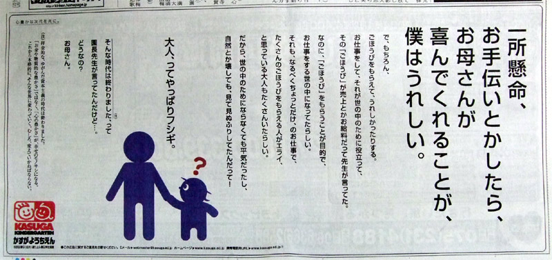 ほう れん そうは大事です!人のふり見て我がふり直せ自分もそうなってないか!今一度考えるnodaichiです! さっそく今日は!ぐぐ~~っときたネタを紹介させてもらいます! いつもワタシがお邪魔するこーちゃんさんの(この人は年下なのにスゴイ人!)ブログに紹介されてた新聞の広告なんですが・・・ これはぐぐ~~とキタね~ おそるべしかすがようちえん!おそるべし!コレを見つけたこーちゃん! 字見えるかな~? あ・・・見えない! ので書きますね~ 一所懸命お手伝いとかしたらお母さんが喜んでくれることがボクはうれしい で、もちろんごほうびをもらえて、うれしかったりするお仕事をして、それが世の中のために役立ってその「ごほうび」が売り上げや給料だって先生が言ってた。なのに 「ごほうび」をもらうことが目的でお仕事をする世の中になってたらしいそれもなるべく ちょっとだけのお仕事でたくさんの「ごほうび」をもらえる人がエライと思っている大人もたくさんいたらしいだから世の中のためにならなくても平気だったし自然とか壊しても見てみぬふりしてたんだって!大人ってやっぱりフシギ。そんな時代は終わりましたって園長先生が言ってたけどどうなの?お母さん