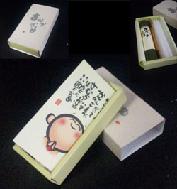 今日はめずらしくPCに向かう時間が豊富ですちょこっとブログの表紙とか変えてみようかな~などと思いブログを開き新しいページをフォトショップでつくりアップしようか!・・・とおもったら・・・すっかり使い方を忘れてしまい・・・HTML何それ(・・・って言うのは言い過ぎやけど)すっかりぽっかり忘れてしまいました。いじっていれば思い出すのでしょうがそれに費やす時間がない ということで今回nodaichiの新作紹介します。題して「ありえない線香パッケージ」まずはこれ!ほい「あなたと出逢えた このご縁に感謝」そんで次がこれ!どん!「たくさんの仲間たちにささえられて今があります ありがとう」 ですどす 思いっきり表からはみ出してます(笑)いやはみ出させてるんです(キッパリ)この箱作るとき箱屋の友人から「あのさ~箱からデザインのはみだすとけど・・・」と、わざわざ電話がかかってきた ねらいです!わざとじゃありません が・・ど~かな~やりすぎたかな~次は表にきっちりおさめようかな~などと若干 引き腰になってます(笑) とりあえず地域限定発売にしようと思ってます。その反応しだいで はみだすのかはたまたきっちりおさめるのか決めようと思います(弱腰です)
