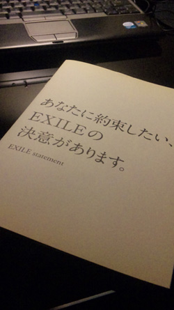こんなものをみつけた自由にもらって行ってよかったようなのでもらって帰ってきたこれ!「あなたに約束したいEXILEの決意があります。」だと! 中を開いてみると1、EXILEは、「Love,Dream,Happiness」をテーマに活動し続けます。2、EXILEは、エンタテインメントの究極を追求し続けます。3、EXILEは、「EXILE GENERATION」というシステムで走り続けます。 ・・・と、まぁ~大きく三つのテーマに分けて説明がなされているそして最後にEXILE statementの〆にビジョンを図式化 こういった資料って会社関係などでよく目にする「経営計画書」 EXILEにも このような計画書があるとは・・・なるほど場当たり的なヒットではないことがよく解かった やるじゃんEXILE