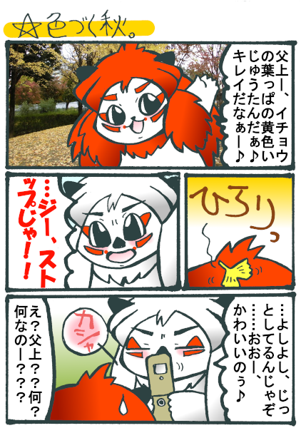 落ち葉のじゅうたん、きれいですよねー。 で、ジーちゃんの頭の上にイチョウの葉っぱ…