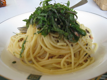 ご飯がなかったのでパスタを作ってあげました。庭のシソと梅肉他で冷製パスタうまあ~ な出来でした♪