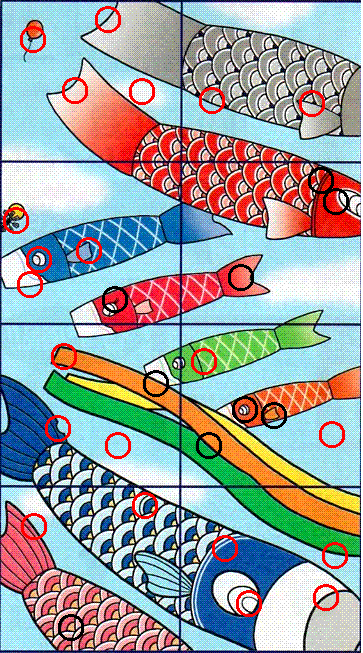●beパズル先週の私の答えは合っていたようです。よかったです。A.間違い探し…B(A:4 B:2 C:5 D:3 E:4 F:5 G:3 H:4)A 風船の有無 真鯉(黒)の尾鰭の形 緋鯉(赤)の尾鰭の形 真鯉(黒)と緋鯉(赤)の間の雲の有無B 真鯉(黒)の尻鰭の有無 真鯉(黒)の胸鰭の形(大きさ)C 幟竿の先の矢車の有無 子鯉(青)の目の模様 子鯉(青)の胸鰭の長さ 子鯉(青)の髭の有無 子鯉(赤)の睫毛の有無 D 緋鯉(赤)の首の模様 緋鯉(赤)の目の模様 子鯉(赤)の尾鰭の長さE 吹き流し(橙)の長さ 吹き流し(橙)と子鯉(黄緑)の上下関係 星の有無 真鯉(青)の尾鰭の欠けの有無F 子鯉(黄緑)の胸鰭の有無 子鯉(橙)の目の形 子鯉(橙)の胸鰭の位置 鳥(鴎?)の有無 吹き流し(橙)と吹き流し(緑)の上下関係G 真鯉(青)の鱗の模様 緋鯉(桃)の尾鰭の大きさ 緋鯉(桃)の鱗の模様H 吹き流し(桃)の有無 真鯉(青)の口の模様 真鯉(青)の目の模様 真鯉(青)の首の模様※ 左右は右側の(A~Hに分かれている)絵をベースにしています。B.クロスワード…タンゴノセツク(端午の節句)カナ タネアカシシゴトバ キツテワヤク マスク モ ギター ウエチカ イクジ メ ミヤコ タカライノチ アクセルシケンカン イドC.数独…10563982714984167523271354986398721645145836297627549831712495368436278159859613472●チャレクロ2012[5月4日]・クロスワード編(5)…グリーングランド リヨウガルイ クラク メスメトロ イツキ タ アーバン ヨキンカツコク トウヨクギプス カンソウ カ トイシ ウカイツミ サラシ シヤコツトン ヨーヨー・数独編(3)…6239617854657428931841593726198276345365149278472385169713864592584932617926751483[5月5日]・クロスワード編(6)…ナツバシヨ(夏場所)キズ ヒツコシソバセイシガ トツ サツ ロシア モヤシフカミ ドリンク クリ カバン シオ ウオベイ ジヤーフムキ スイジ ドツ ナサ シヨウブカンワジテン タル・クロスワード編(7)…カンコウ(観光、刊行、慣行、官公等)タケトリモノガタリチイ ツナ イデユミコミ コウカ ウ ウエア ケンブツセト イズモ ツウツウカイ チコク ゾ ランプ シカイクロメ ラフ バラゴールデンウィーク※ 私の家に配達された新聞(13版)紙面とインターネットでは5月5日分のクロスワード編(6)とクロスワード編(7)が入れ替わっていますが、前者に従っています。