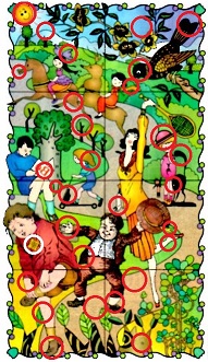 A.間違い探し…D(A:4 B:4 C:4 D:2 E:5 F:4 G:4 H:3)A 太陽の顔の傾き方 中央やや左上の木の葉の部分の有無 馬の口の形 女性の髪飾りの形B 黄色い花の数 鳥の尾の長さ 鳥の顔の向き 女性のオレンジ色のスカーフの長さC 2頭の馬の脚の重なり方 アルファベットの「B」の大文字・小文字 キックスクーターの乗る子供の髪の形 道路沿いの木の本数D 桃色の帽子の有無 猫の尾の向きE ブローチの有無 キックスクーターの前輪上部の形 木の根の形 男性の右手の高さ 男性の上着の右裾の長さF 猫と女の子の重なり方 帽子のリボンの長さ 女性の右手の形 女性の右足先の向きG 右手の腕輪の有無 右足と葉の重なり方 右足先の形 男性の真下の葉の有無H バケツの有無 男性のズボンの左足の裾の長さ 木の幹の模様の黒丸の有無※ 左右は向かって右側のA-Gに分かれている絵を正面から向かって見た場合を基準にしています。