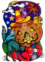 A.同じもの探し…10と13(1.落ち葉の外側の欠けの有無 2.真ん中上の前歯の有無 3.紅葉と帽子の間の星の有無 4.上のリボンの先端の長さ 5.猫の右後ろ脚の位置 6.帽子の先端の形 7.猫の尾の長さ 8.上の雲と月の上下関係 9.右肘と枠の関係 11.額の割れの有無 12.鼻の大きさ 14.ハードブレイク)