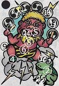 A.同じもの探し…3と11(1.番号脇の雷の向き 2.蛙の向き 4.足首の輪の数 5.鬼の上の歯 6.パンツの紐の結び目 7.右手のバチの向き 8.前掛け中央の長さ 9.右膝後ろの雲の有無 10.右上の雷と太鼓の前後関係 12.蛙の右目 13.左耳脇の太鼓の柄 14.ゲップの有無 15.蛙の左手)