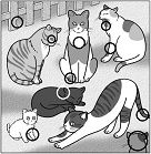 ・猫の間違い探し…右上の猫…舌の出方/左手のぶちの数…上中央の猫…胸の白い部分の広さ/右足先のぶちの有無…左上の猫…眼…中央左下の猫…首輪の有無…中央下の猫…尻尾の長さ…左下の猫…左手の位置…右下の猫…有無…柵…欠けの有無