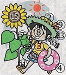 A.同じもの探し…1番と12番(2.帽子の山の形 3.服の合わせ部分の形 4.浮輪のフリルの有無 5.右手の袖の長さ 6.鞄の紐と本体の前後関係 7.肘の後ろの葉の位置 8.目 9.帽子のリボンの数 10.スカートの段の数 11.鼻緒 13.帽子の縁の形 14.髪の長さ 15.ひまわりの筒状花の形)