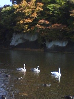 親子(グレーの幼鳥3羽とママパパと)の白鳥達が2家族(?)って感じです。