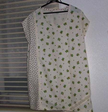 こちら、宮城はすっと、雨です。今日は23度ですが、雨のせいか、寒い(^_^;)フード付きコートを着て出かけたら、ジャケットやジャンパー姿の方が多くて、みんなで「寒いよね」と、、、もうすぐ、8月だというのにね、、、さて、前回の残りのリネンでやっぱりチュニックを作りました♪柄違いというか、配色違いです(爆)バイアスを作った分生地がちょっぴり足りなくて、思いついたのが、前にも使ったテクニックそう、レースを挟むテクニックトーションテープを使いました裾の斜めのレースですついでに、生地の切り替えにも付けたら、切り替え部分の茶色のドッドが柔らかい感じで繋がりました。前回ブログで紹介した、チュニックです微妙にデザイン変えています。どうして、いつも、切り替え入れているの?と思うでしょ。身幅が足りないの(爆)だから、切り替え入れて、身幅をはいで1メートルで完成させています。気に入った生地を見つけたら、1メートルだけ購入です。