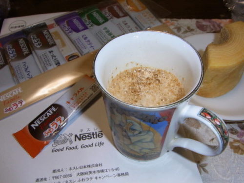 ネスレふわラテ キャンペーンで当選です(^_-)-ネスレのふわラテを飲みますまったりしたい時、一人でゆっくりお茶したいとき、お友達が来て、デザート感覚でカフェ風に飲むのが好きです いつもは、気分で買っていますが、こんなに種類があったのですね。こんなセットで頂けたので、とっても嬉しいです♪まずはまだ飲んだ事のないキャラメルを頂きました。あら、自宅カフェだわ♪と ひとりお茶を楽しみます(#^.^#)