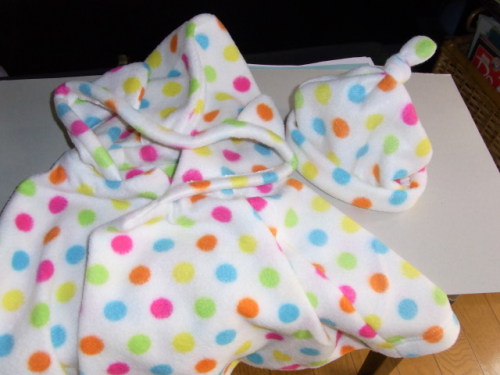 ベビーマントを作ってみました手芸やさんの生地売り場はフリース生地が一杯暖かそう可愛い柄だわピンクのドットと迷って、主人に相談そして、カラフルドッドに決定可愛いわ!少しでも四角く生地を残したくて(爆) 残り生地をギリギリ上手く使って、帽子そして、残り1メートル×50センチはひとまず、ジグザグかけて、ブランケットにでも利用できるようにしておきました。でも、多分、ベストか何かに変身するだろうな 1カットクロスで 3点できたから、いいかな。手作りの醍醐味です