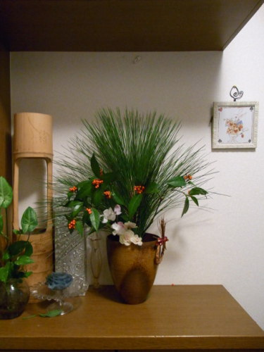 お正月用に生けたお花です写真を撮り忘れていて、昨日少し手直ししながら撮りました頂いた大王松です昨年とおんなじパターン、、、じゃないかお花やさんに行きそびれてスーパーでお花を物色千両とスィートピーを購入大王松は広がるので千両で前を抑えています玄関に咲いているハボタンを追加~バラのように可愛いです昨年のゴールドの枝もあったので今はこんな感じです千両は流れをつけて生けているのですが、、、平坦に撮れていますねそのうちゆっくり、別バージョンい変身させます何年か前にストレチアを入れて生けたのが好評だったので、来年は新たに挑戦したいさてお花と言えば若い時母にお花を習いに行かせられていましたその時はしぶしぶその時一緒だった友達が偶然転勤先で一緒になり親しくさせて頂いていましたがその後、ずっと音信不通にそれが先日再会しましたなんと、近所に住んでいました実家が同じで母同士も知り合いだったのでその関係で連絡が付きました嬉しい再会ですこれから、おしゃべりに花が咲きそうです同じ門下生なんですよね。お花のお稽古では、、、と二人でウフフフと
