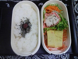 ■白米 宮城の絆Boxに入っていたもの■人参入り卵焼き 消費期限が危うくなった卵を使い切るため昨日作成。 人参もかなり中途半端に残っていた(Nolaが弁当作成をせず会社に来たとき、 学校が休みで家に居たちびNolaがラーメン作って食べたときに使ったらしい)のを 摩り下ろして使用。■リーフレタス らで箱に入ってたのでバラン代わりに使ってみた。 あ゛…今日らで坊の日なのに箱を出してくるの忘れてた…。■大根のゆかり和え その名の通り…つーか、名前なんかなく、らで箱に入ってた大根を いちょうに切って紫まぶして少し水抜きしただけのもの。■人参サラダ 卵に使った人参の残りを使い切るため作成。 千切りにして、レモン汁かけて、 ゆず茶の元…というか、要はゆずマーマレードで和えただけ。最近順位が落ち込んで寂しいNolaに愛のひとぽち⇒にほんブログ村