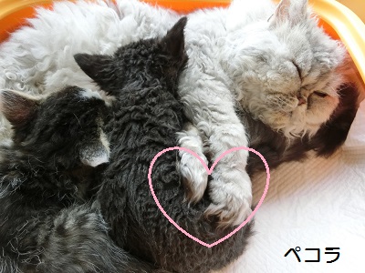 祝 ペコラ君 お家 GET ペコラ君 生まれた時は 小さく痩せた男の子でした ニャンパック離乳食も 他の兄弟に気圧されて 残り物を ぺろぺろ・・・ そういう子には お皿からではなく 個別に 手で 直接 食べさせます。 だから 人の手が 大好きになっても 不思議じゃないでしょ? 一生懸命 食べて 大きくなったね。 大変良く頑張りました。 ペコラ 「ニャンパック 大好きですにゃ♪」 甘えっこ ペコラ君 カーペットの上で 引きずり転がりがお得意 レオナルド君と お昼寝 ↓ パパ お迎えありがとうですニャ にゃんこのお姉ちゃん 人のお兄ちゃんと 仲良く遊んでね! 覗いているのは 誰? ペコラくんの おねえちゃん 「ミュー」ちゃんです♪ よろしくですニャ♪