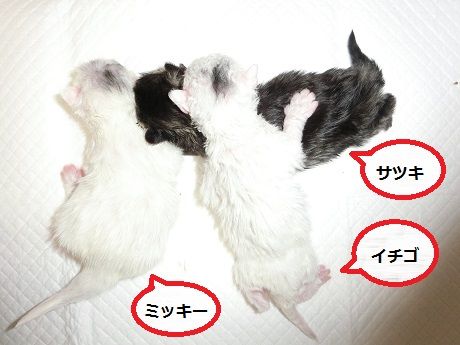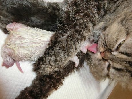 セルカークレックス コレクション5月15日 生まれました!米のあかちゃん 3匹イチゴ君 白 巻き毛 男の子 たぶん短毛サツキちゃん タビー 直毛 女の子 たぶん長毛ミッキー君 白 直毛 男の子 たぶん長毛大きな子ばかりで驚きました。イチゴ(15日)長男サツキ(五月)長女ミッキー(なぜ?)次男