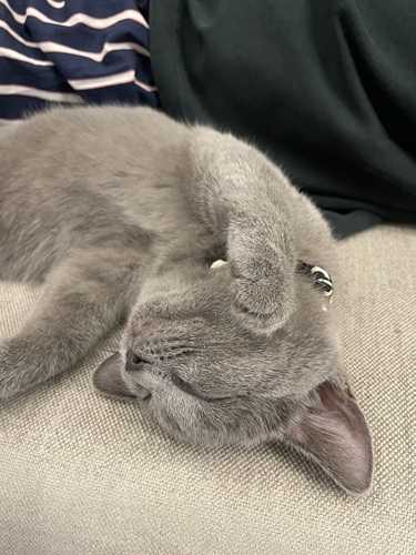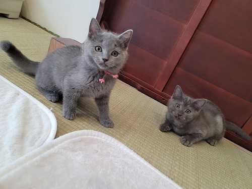 シャルシャル通信つきみちゃん お家に帰りました!兄妹の中で一番大きな体つき。顔の側面、垂直に立った耳。美しく整った顔立ちのつきみちゃん。濃いグレーの大きなユエパパにそっくり!将来が楽しみな娘です。お祖母ちゃんが「月」お父さんが「ユエ」(中国語で月)つきみちゃんは漢字で書くと「月見」かな?お家に帰るとパパママにお兄ちゃんがふたり。たくさん遊んでもらえますね!猫じゃらしに勢い込んで飛びつく遊び方をするギャラガー君やブルーちゃんとは違って追いかけてダッシュはするもののチョイチョイと手で引っ掛ける、お嬢様らしい遊び方。その内スルスリし始めてゴロゴロゴロ…。大人しくも甘えん坊なつきみちゃんでした。
