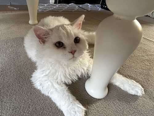 セルカークレックスコレクションラナちゃん 生後10ヵ月お便りひろみさん こんばんはらなちゃんは 生後10ヵ月を迎えました。毎日 可愛いです。昨日 初めてらなちゃんのお髭を見つけました。(拾いました)根本が癖毛で黒色からグレー→白色と1本でグラデーションが見られました。貴重ならなちゃんのお髭 ありがたく頂戴しました。なんだか 幸せです。らなちゃんの巻き毛はくるんくるんとおおきくカールするタイプでも、ちりちりと細かく縮れるタイプでもありません。毛の一本一本が、くるんと半円を描いているので、全体的に体格の2~3倍大きく膨らんで見える熊の子タイプ。毛の中に手を入れると手の甲が隠れてしまう位の短毛です。そのせいで、もっこもこな楕円の顔に小さなお耳がチョコンと付いてまるで、漫画に描かれたにゃんこそのものです。「ぬいぐるみ?」そんな可愛らしさで キューンとさせちゃう らなちゃんです。セルカークはしっかりしたカールのお髭を蓄える子もいますが、殆どの子のカールした髭はか細く、すぐ切れてしまうことが多いので、偶然拾うことは少ないと思います。お顔にも疎らにしか生えていないらなちゃんのお髭GET おめでとうございます!究極の「猫飼い」さんは、猫のお髭も貴重なのです。 うふふ。