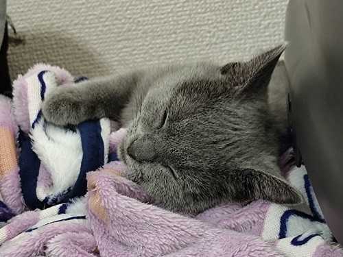 こんばんはカレンちゃんは、元気で育っています。昨日の体重測定では、ついに2kgを超えて2.15kgになりました。体つきもしっかりして来て、たくましさも感じるくらいしっかりしてきました。日々の成長が嬉しいこの頃です。そのせいもあって、とにかく、活発で…。じっとしている事が無く、オモチャで遊ぶのが好きで、よく走り回って遊んでいます。まぁ子猫の頃は皆んなそうだと思いますが…。なので、写真もなかなか撮れず…。困ったものですが、そうかと思えば、疲れて眠たくなると、電池が切れたように、ゴロゴロと言いながら、私の横でコテッと寝てしまう姿を見るととても可愛くなってしまいますね。ひとりの留守番が可哀そうに思うこともありますが、お友達の二匹目は…もう暫くしたら考えたいと思います。その時は、また、河田サンにお世話になりたいと思います。カレンちゃんは、とても良い子で元気に育ってくれていますので、ご安心を。11月に入りここ最近は、名古屋も寒い日が多くなって来たのではないでしょうか?河田サンも、お体に気を付けてお過ごし下さいネ。頂いた、猫じゃらしは、カレンちゃんお気に入り、まだ壊さず毎日大活躍しています。ありがとうございます。***こんばんは~かれんちゃんの幸せそうな寝顔良いですね~なでなでされるのも大好きみたいで良かった。猫は犬のように集団で生活することが得意ではないので、そんなに寂しがりませんよ。でも、パパが大好き過ぎると始終ベッタリと依存するそうです。不思議ですね。お仕事が忙しすぎて接触が無いというのは心配ですが、ちょっとやそっとの留守番なら平気、平気。多頭飼いに憧れるならカレンちゃんが2歳になるまでにお友達を迎えるのがお勧め。ちゃんとスキンシップが取れているなら無理やり2頭にする必要はありません。動画はブログにアップできないけれど、可愛い寝顔はみんなに見せびらかしちゃおっと!
