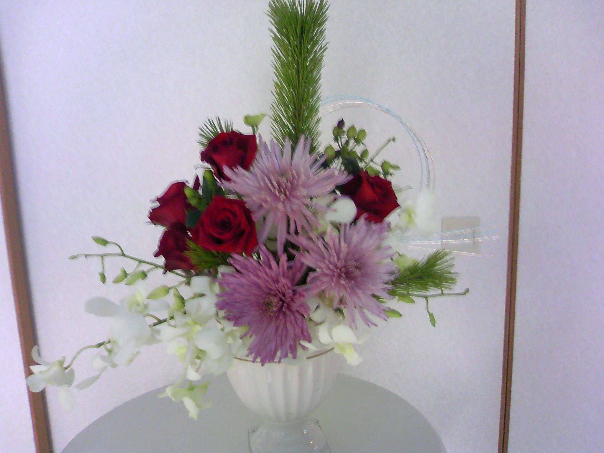若松・菊・白いデンファーレ・赤いバラ