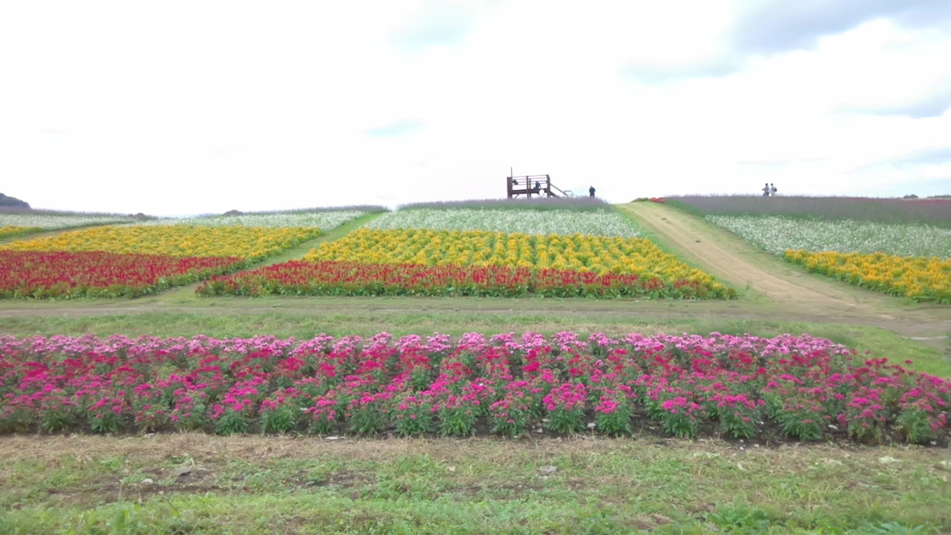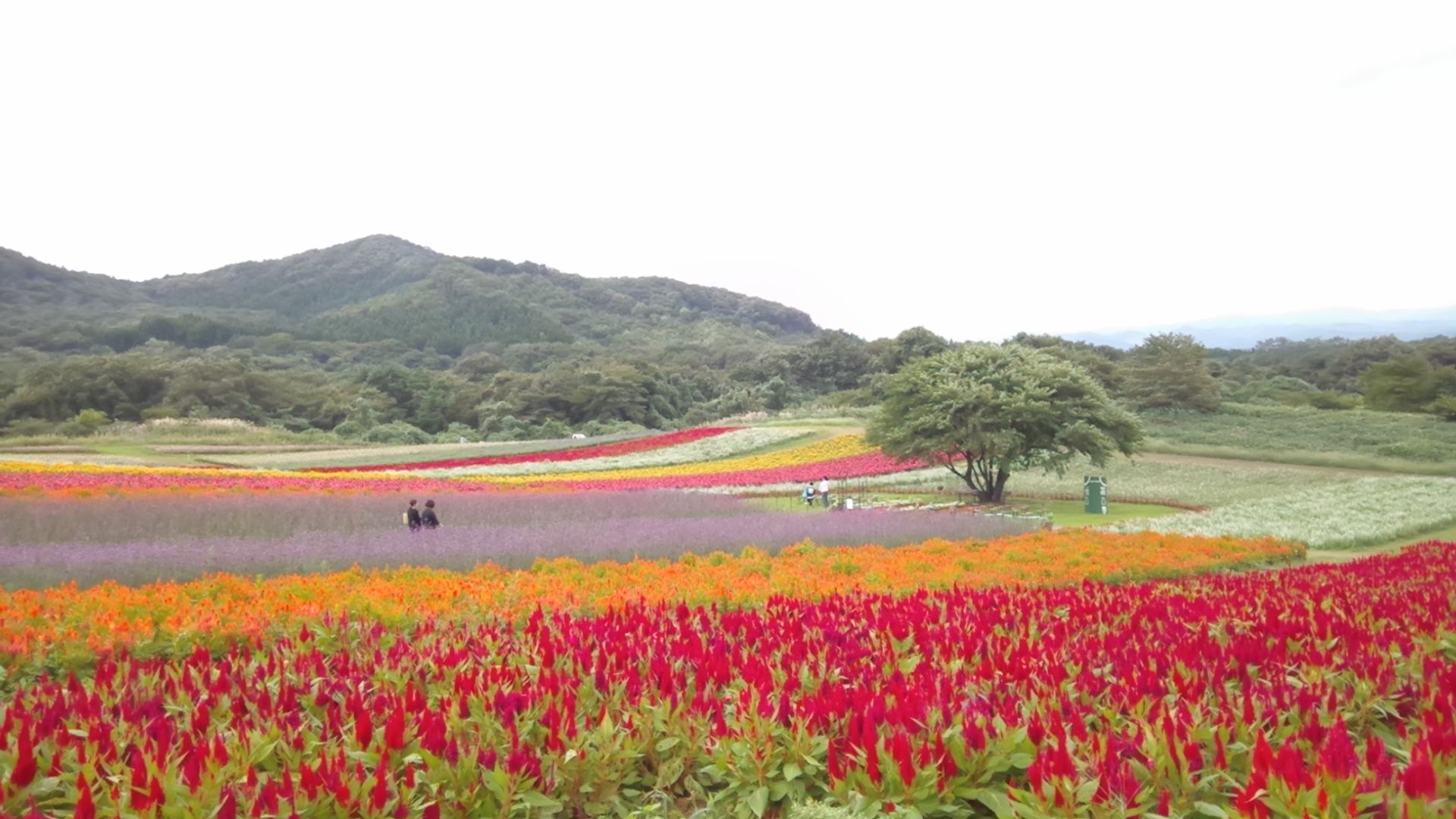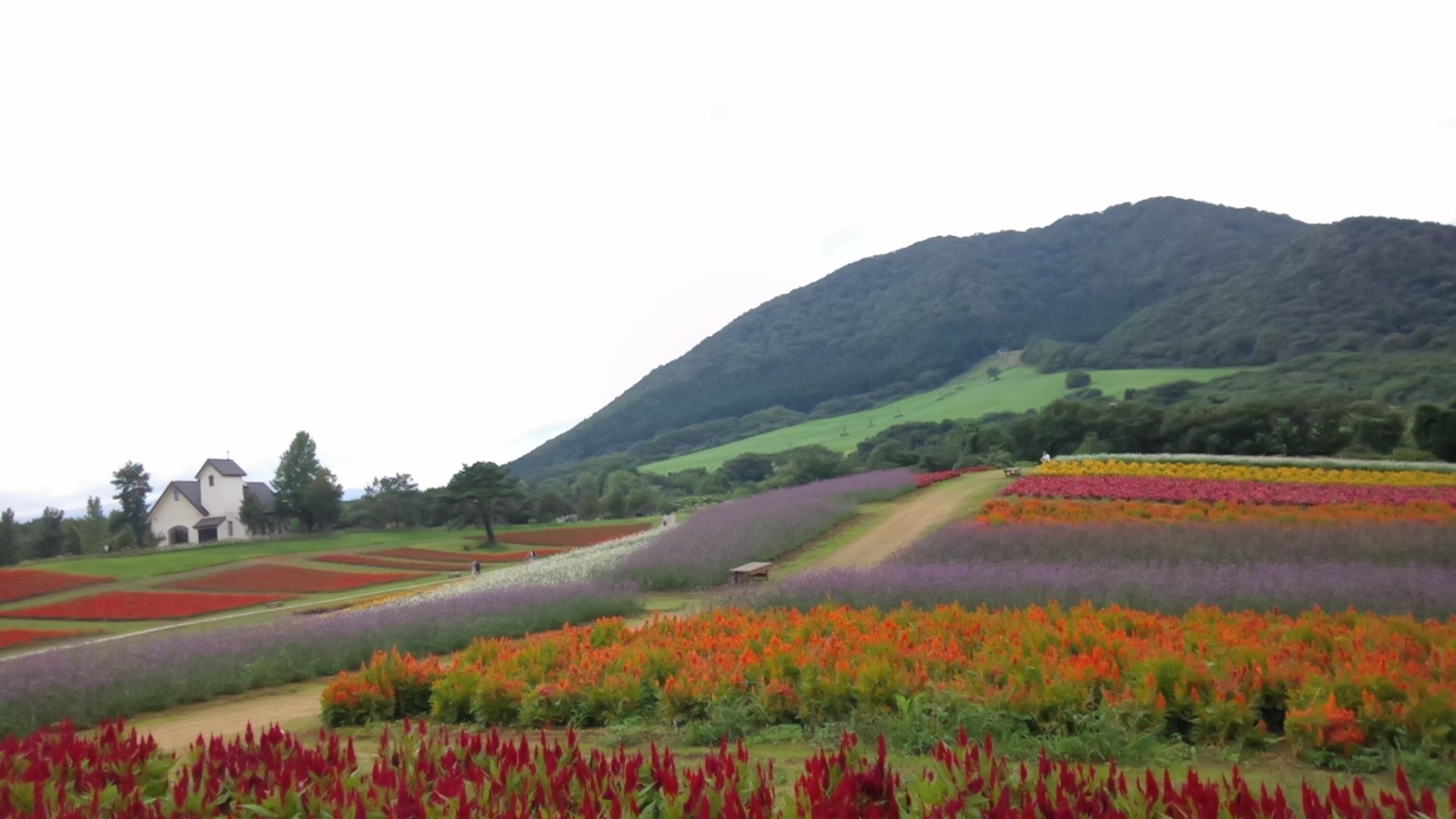 9月の中旬曇り空時折おひさまも顔を見せてくれました、花畑がすばらしい!北海道の富良野に行けないけどとても気持ちいい、今度富良野にも行きたい、この日は赤いサルビア,けいとうの赤、黄、ブルーサルビア、撫子の赤、もも、ピンク、白い花