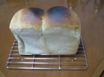 前回は、上部の角がピチッと出なかったんだけれど、今回は大成功!使った型は、フッソ食パン型 正角。前回は、2次発酵を型の4分の3くらいまでした。今回は、型の9分目までじっくり待った。それがよかったのかなー。配合は、ほぼ同じだし。膨らむ力が強かったのか、型のふたの中央がちょっと膨らんだ。イーストの力で、金属が曲がるんだねえ。すごい。