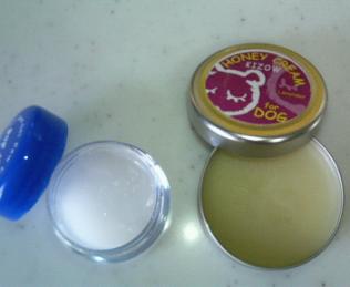 今日、注文していた肉球の保護クリームが届いた☆左が今まで使っていたもの。右が今回購入したもの。違いは以前から使っていたものはジェル状でドロッとした感じなのに比べて、今回購入したものは蜜ロウで少々硬めな感じ。何よりもの違いは、ジェル状の方は、口・目・耳・傷などに入らないようにして下さい。って書いてあるのに対して今回買ったものは、100%天然成分で舐めても安心らしい♪大きな違いだよね~コレは!さっそく使ってた感じ↓《使用前》《使用後》見にくいけど、少しツヤが出た感じ。角質化や傷などは、1回だけの使用で急激に変わるもんでもないので、気長に続けていこう。使用感も変にベタベタせず、自分の指や膝・肘などにつけてもしっとり、サラサラ!これは、買って大正解でした♪この商品に付属していた説明書にちなみに肉球ケアの大切さとして↓肉球が角質化しているとひび割れを起こしたり、さらにそのヒビに異物やバイ菌が入って化膿したりトラブルの原因となります。素肌のワンコにとって肉球のひび割れは痛いはず。また、硬化すると床で滑りやすくなり、外傷や骨折、間接等のトラブルの原因にもなりかねません。ふむふむ!気長に続けてプニプニ肉球を取り戻すぞ!さっそく、お手入れして保護できた肉球でお散歩に行ってきました♪立ち止まって、鼻をクンクン。春の匂いでも、漂っていますか?^^《ワンクリック》へ